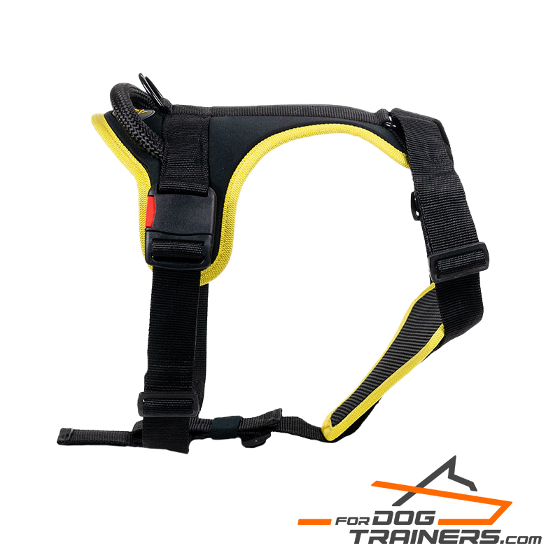 The padded parts increase comfort of the dog. Your four-legged friend will enjoy wearing this outfit without feeling skin rubbing or irritation. This nylon harness is made so as to follow the body lines correctly. The load is evenly distributed across the torso of the canine. There is a heavy-duty handle which is very easy to grasp when there will be the necessity to have tight control over your pet. The handle is comfortable and does not slip in the hand. Innovative system of adjustment allows you to fit this dog harness accurately to the body of your canine. The accessory does not prevent the canine from motioning with the head, legs, shoulders and neck.